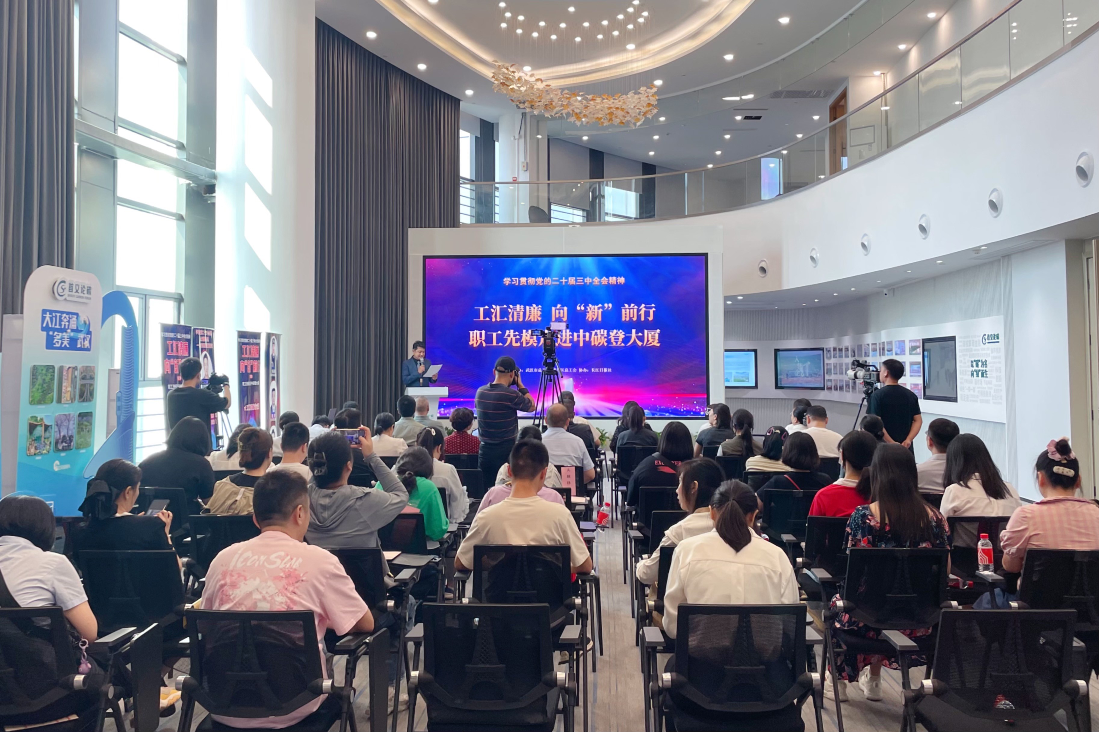 2024年9月27日,由武汉市总工会、武昌区总工会联合主办,长江日报社承办的“工汇清廉 向‘新’前行”第二场主题活动在中碳登大厦举行。武汉市总工会党组成员、经审会主任马欢,武汉市总工会宣传教育部副部长贺鹏,武昌区总工会党组书记、常务副主席钟桃云出席会议。永业行党委委员、高级副总裁文云波参加会议,并作《学习贯彻党的二十届三中全会精神 全力赋能绿色转型——永业行实现高质量发展新局面》主题宣讲。 马欢代表武汉市总工会向武昌区总工会和各级先模代表、工会干部及职工代表表示衷心感谢并致以诚挚问候。他表示,工会作为党联系群众的桥梁纽