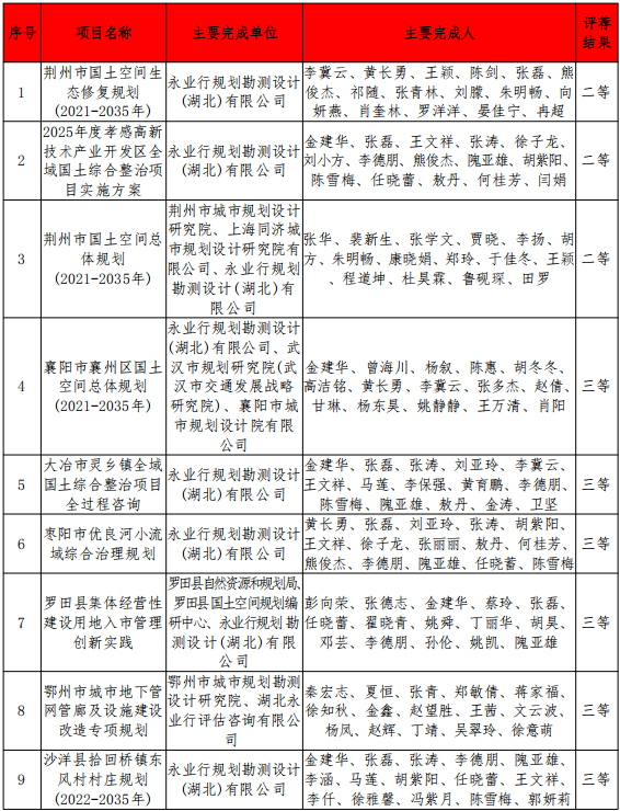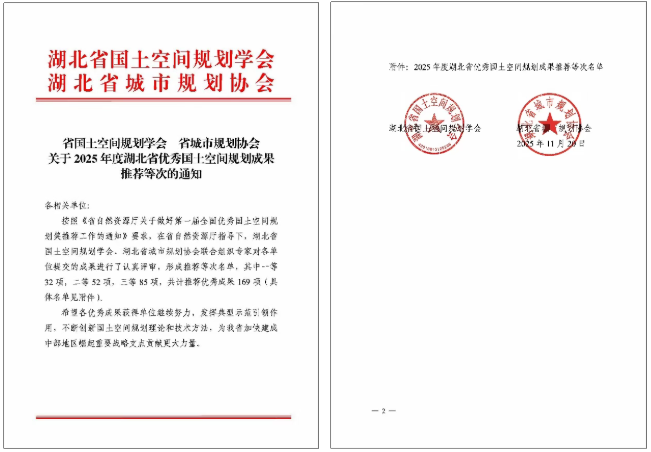 近日,湖北省国土空间规划学会、湖北省城市规划协会联合公布2025年度湖北省优秀国土空间规划成果获奖名单。永业行凭借扎实的专业功底与创新的规划理念,共有9个参评项目从众多成果中脱颖而出,成功摘得二等奖3项、三等奖6项,用亮眼成绩彰显行业硬实力!